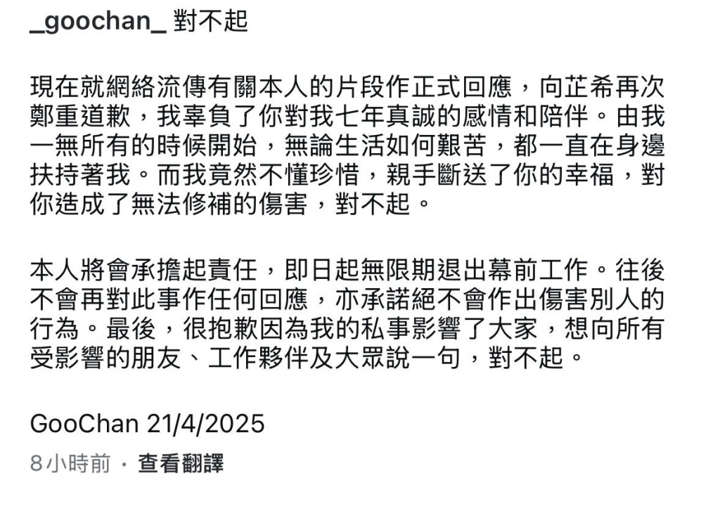 Goo Chan昨晚在IG發(fā)文致歉。