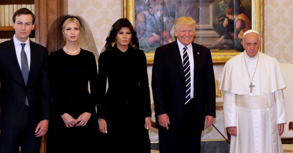 特朗普與梅拉尼婭及女兒伊萬卡、女婿庫什納,2017年拜訪教宗方濟(jì)各。