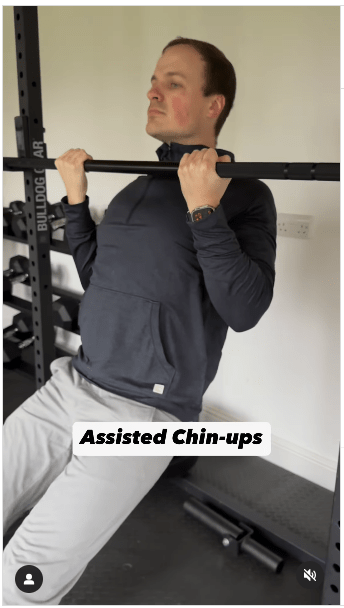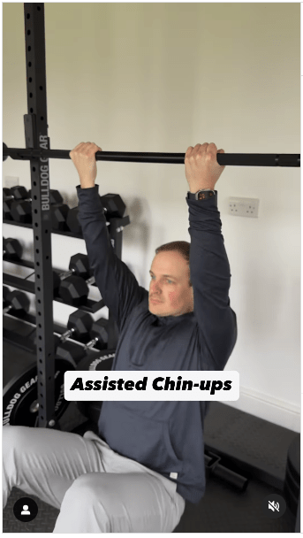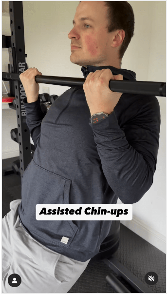 1. 輔助型引體上升步驟:雙腳踩在地板上支撐身體,向上拉動身體,直到下巴高于橫桿。 做這個動作時,想象一下將肩胛骨擠壓在一起。 (IG@olliethompsonhealth)