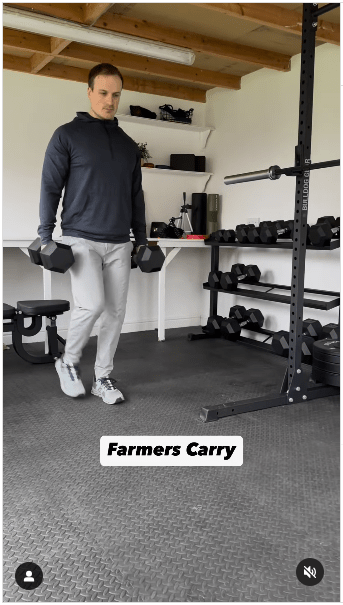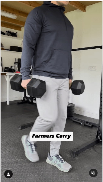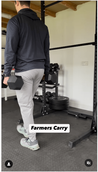 3. 農(nóng)夫行走步驟:保持身體直立,收緊核心,負重行走。 (IG@olliethompsonhealth)