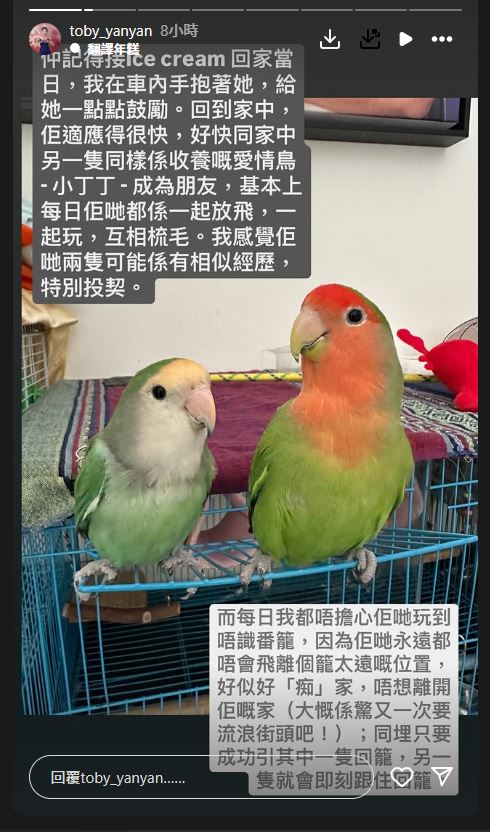 陳庭欣今日在IG宣布愛情鳥“ice cream”昨日突然離開,陳庭欣憶述兩人多年相處經(jīng)過,她說(shuō):“2018年某一個(gè)下午,收到一位女士嘅DM,話喺元朗拾獲一只橙色頭嘅愛情鳥,身體瘦削,仲被附近的貓咪欺負(fù)唔識(shí)點(diǎn)處理,所以問我點(diǎn)算。當(dāng)時(shí)我嘗試教佢點(diǎn)樣先安置好雀雀,同時(shí)即刻上各大鸚鵡群組發(fā)帖希望搵番主人。雖然嗰位女士都好想幫忙暫養(yǎng)雀雀,可惜因?yàn)闊o(wú)經(jīng)驗(yàn)同家中有小孩,不方便暫托或收養(yǎng),于是我就接咗雀雀到我家中暫住,一邊繼續(xù)幫佢搵番主人,可惜過了很久主人都無(wú)出現(xiàn)過。最后我決定收養(yǎng)牠,拾獲嗰位女士嘅小女兒幫雀雀改咗個(gè)名,叫 Ice Cream?!标愅バ婪QIce Cream適應(yīng)得很快,與另一只愛情鳥小丁丁成為朋友。