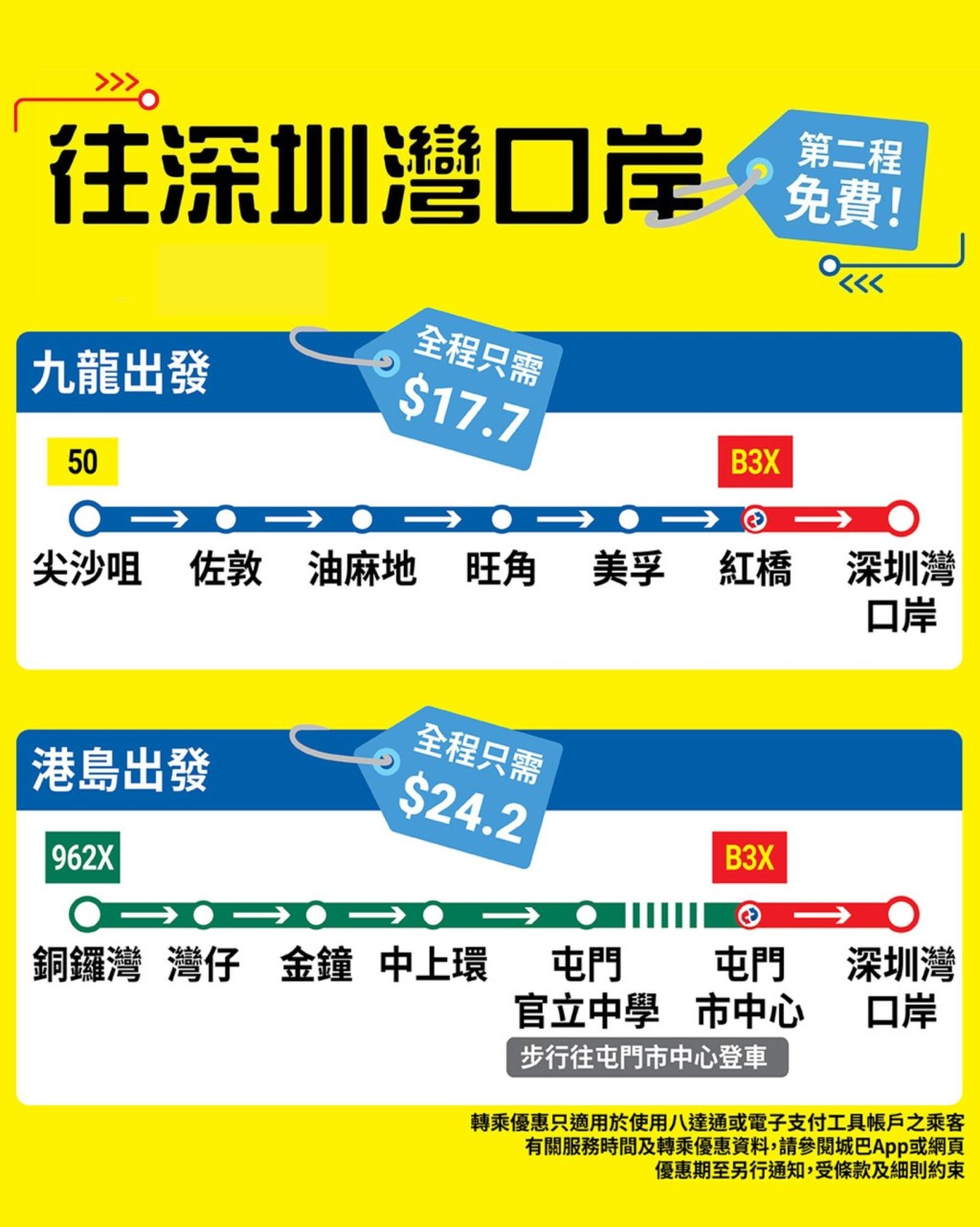 至于港島居民,現(xiàn)只需首程乘搭由銅鑼灣摩頓臺(tái)至屯門龍門居的962X線巴士,于屯門官立中學(xué)步行往屯門市中心轉(zhuǎn)乘B3X往深圳灣口岸,同樣可即享深圳灣口岸“第二程免費(fèi)”優(yōu)惠,全程車費(fèi)只需HK$24.2,即省HK$16.5。