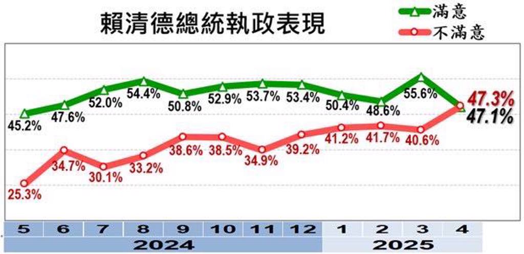 根據(jù)美麗島電子報(bào)民調(diào),賴清德執(zhí)政滿意度出現(xiàn)死亡交叉。