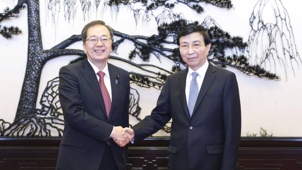 王滬寧在北京會見日本公明黨黨首齊藤鐵夫。 新華社