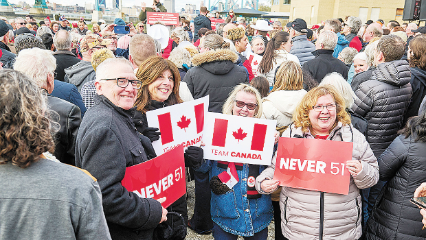 當(dāng)?shù)貢r間4月26日,加拿大安大略省,在總理、自由黨黨首卡尼的競選集會上,民眾舉著“絕不成為美國第51個州”的標(biāo)語