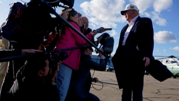 ▲當?shù)貢r間27日,特朗普在美國新澤西州莫里斯敦市一機場登機前向記者發(fā)表講話 圖源:外媒報道配圖