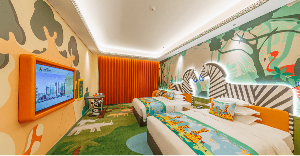 而長(zhǎng)隆樂(lè)園的親子酒店備受家庭客歡迎,而清遠(yuǎn)長(zhǎng)隆長(zhǎng)頸鹿城堡酒店亦屬親子友善,這兒的“長(zhǎng)頸鹿IP”取材自長(zhǎng)隆原創(chuàng)動(dòng)畫片《卡卡虎大冒險(xiǎn)》中長(zhǎng)頸鹿“酋長(zhǎng)家族”的故事,走進(jìn)長(zhǎng)頸鹿家族的城堡就有來(lái)自非洲歡快有力的歡迎曲,也有長(zhǎng)頸鹿酋長(zhǎng)的“入城儀式”,房?jī)?nèi)亦滿布“長(zhǎng)頸鹿IP”,讓大家沉浸于長(zhǎng)頸鹿的歡樂(lè)中。