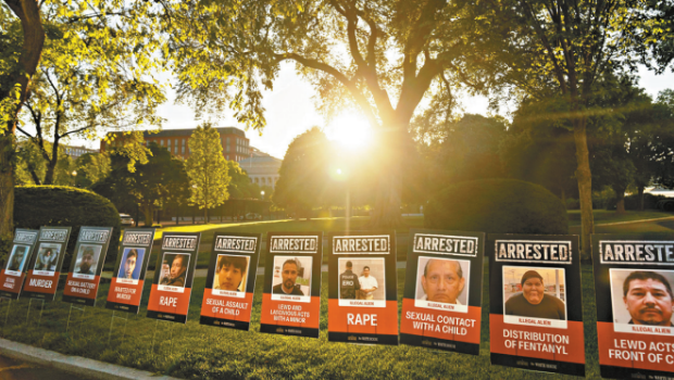 白宮為宣傳其驅(qū)逐移民政策,在北草坪展示數(shù)十張移民大頭相,標(biāo)示各人被定罪或指控的罪名,包括謀殺、綁架、性侵兒童、強奸等。