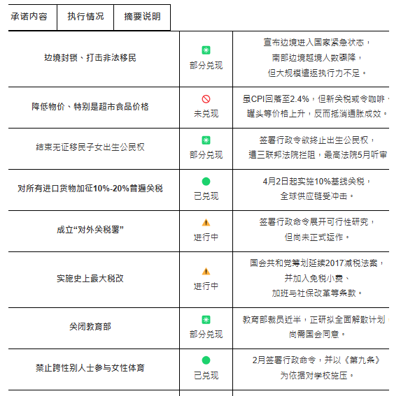 《政客》為特朗普上任100日中,主要施政承諾或推行的兌現(xiàn)情況埋單計數(shù),以下是其中最為人關注的議題,并以表列形式展示。