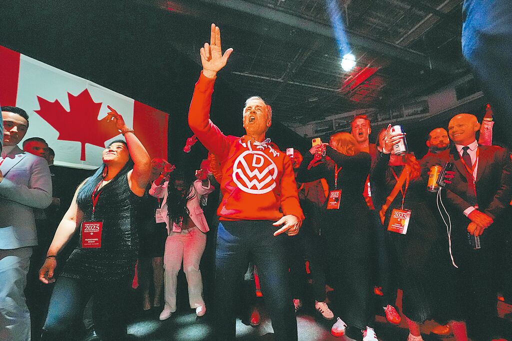 加拿大執(zhí)政的自由黨29日贏得大選后,總理卡尼(中)在渥太華競選總部隨著樂隊翩翩起舞。
