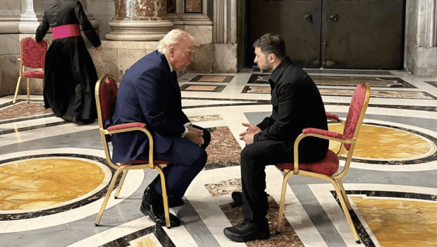 ▲在這張由烏克蘭總統(tǒng)新聞辦公室提供的照片中,烏克蘭總統(tǒng)澤連斯基和美國總統(tǒng)特朗普于 2025 年 4 月 26 日星期六在梵蒂岡參加教宗方濟(jì)各的葬禮時(shí)交談。美聯(lián)社