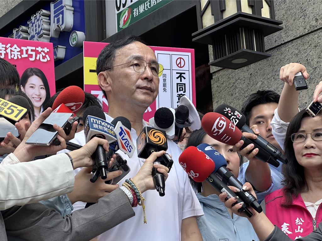 ▲國民黨主席朱立倫今上午前往臺北市永春市場替藍委徐巧芯站臺街講,會后受訪。中時
