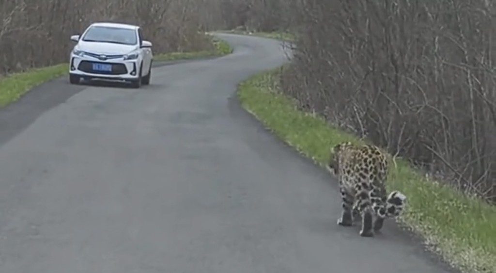 ▲男子乘車遇野生東北豹。極目新聞