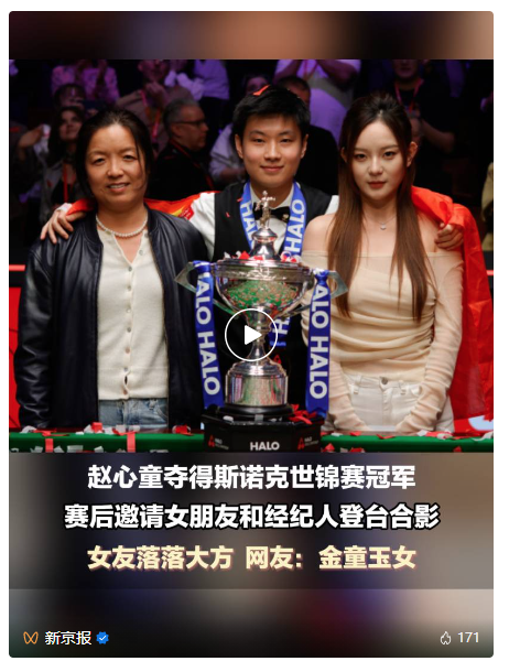 頒獎禮上,趙心童邀請女朋友和經(jīng)紀人一起登臺合影。