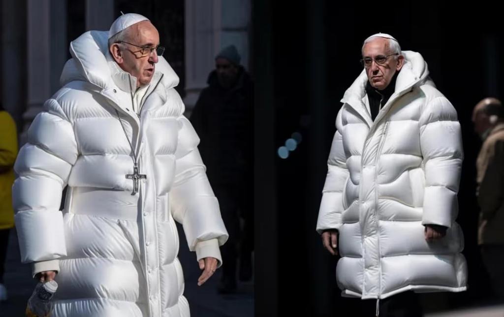 2023年3月教宗方濟各(現(xiàn)已辭世)身穿“巴黎世家”品牌防水外套的照片在網(wǎng)上瘋傳,深刻展現(xiàn)了深偽技術(shù)的危險性。這張照片以AI工具Midjourney制作而成,將文字提示轉(zhuǎn)換成圖片。眼尖者可能會發(fā)現(xiàn)一些破綻,例如教宗眼鏡投下的詭異陰影和奇怪的握手方式,更別提他那華麗裝束了。