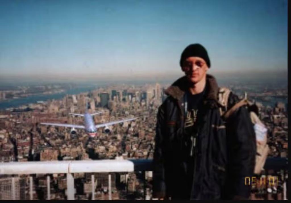 2001年紐約911襲擊發(fā)生后數(shù)天,網(wǎng)傳一男子看似在飛機撞擊前一刻站在世貿(mào)中心觀景臺的照片。