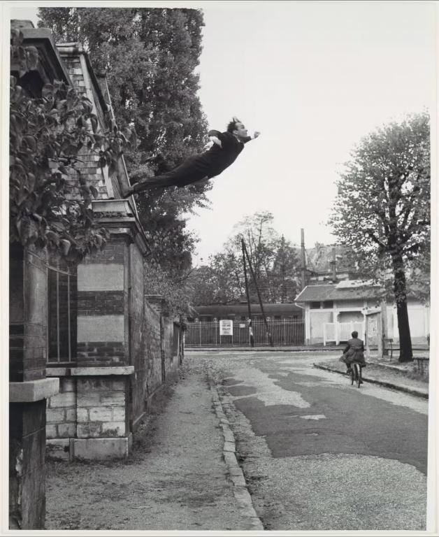 1960年法國藝術(shù)家克萊因作品《墮入虛空》震驚世界,照片看似捕捉他無畏地從巴黎一處屋頂飛躍而下。
