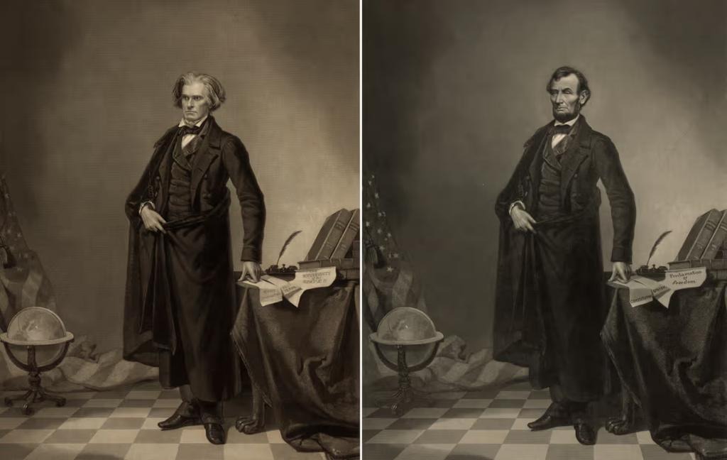 1865年美國總統(tǒng)林肯遇刺身亡,人們開始要求為這位解放黑奴的總統(tǒng)塑造英雄肖像。一幅展示林肯威嚴姿勢的照片橫空出世,廣泛流傳。照片后來被證實為偽造,其實是一名版畫家的創(chuàng)意,將林肯的頭像迭印在其政敵兼奴隸制支持者約翰.卡爾霍恩照片的身體上的創(chuàng)作。