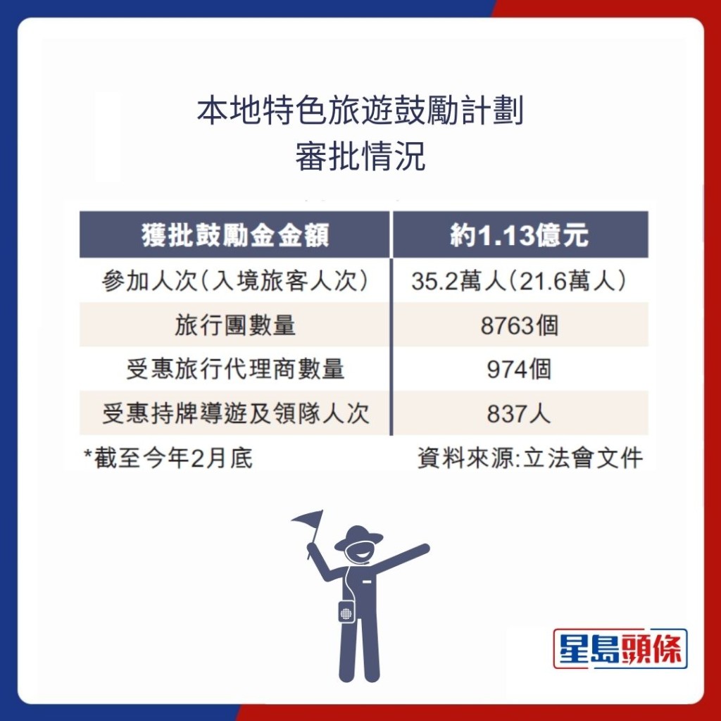 據(jù)文化體育及旅游局于立法會(huì)財(cái)委會(huì)特別會(huì)議的書面答覆,截至今年2月底,“本地特色旅游鼓勵(lì)計(jì)劃”兩階段暫累計(jì)批出1.13億元鼓勵(lì)金,974間旅行社受惠,覆蓋8763個(gè)旅行團(tuán),參加人次達(dá)35.2萬(wàn),當(dāng)中入境旅客占21.6萬(wàn)人次,平均在港停留兩日,約占整體參與人次的61%(見(jiàn)表),反映計(jì)劃成效不俗。