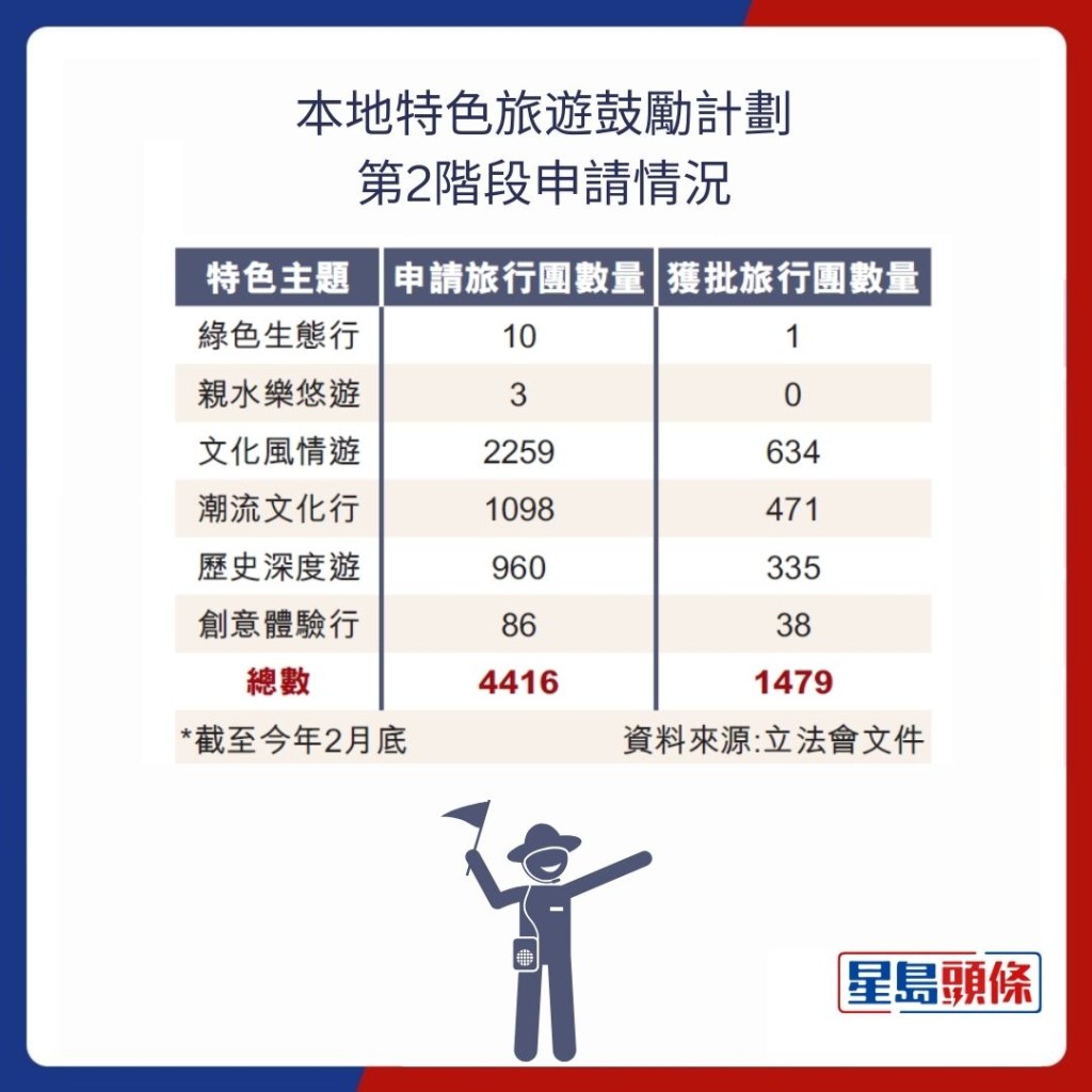 據(jù)文體旅局資料,截至今年2月底,共接獲4416宗第2階段申請(qǐng)(見(jiàn)表),當(dāng)中一半是文化風(fēng)情游,其余的潮流文化行及歷史深度游亦占46%;1479宗獲批申請(qǐng)中,以文化風(fēng)情游的634宗為最多,占超過(guò)42%。