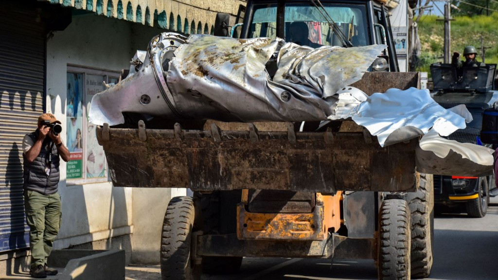 ▲印度軍機(jī)墜毀在距離斯利那加約15公里的帕姆普爾烏延地區(qū)。推土機(jī)正在運送不明軍機(jī)殘骸。 路透社