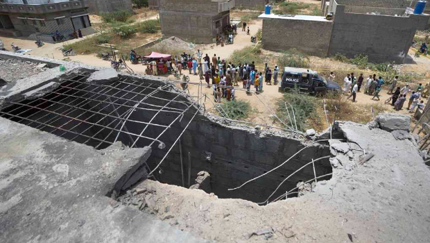 ▲2025年5月8日(星期四),巴基斯坦卡拉奇,一架疑似印度無人機(jī)遭巴基斯坦防空系統(tǒng)擊落后,居民聚集在封鎖線后方,圍觀疑似遭印度無人機(jī)攻擊而受損的住宅屋頂,屋頂上可見一個(gè)大洞。(圖/美聯(lián)社)