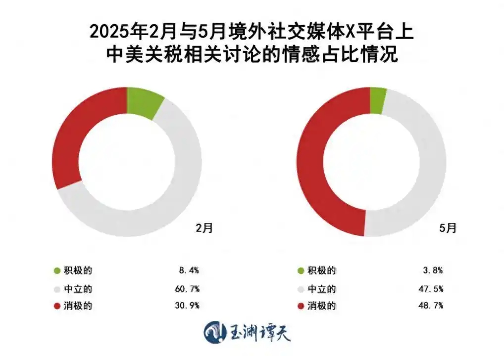 據(jù)美國哥倫比亞廣播公司報(bào)道,4月第二周以來,美國電商亞馬遜平臺上的賣家已經(jīng)上調(diào)了近1000種商品的價(jià)格,平均漲價(jià)幅度接近30%,美國消費(fèi)者逐漸感受到美國政府濫施關(guān)稅帶來的影響。而在特朗普一次又一次對華加征關(guān)稅的過程中,境外社交媒體X平臺上中美關(guān)稅相關(guān)討論的負(fù)面情感占比,已經(jīng)從2月的30.8%上升到5月的48.7%。