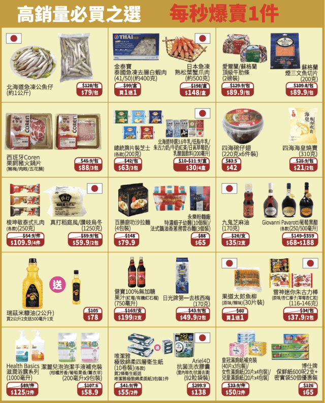 “日本價(jià)格同步專區(qū)”為精明消費(fèi)者提供多款日式商品,價(jià)格媲美日本當(dāng)?shù)?。包括有熊本熊?啡蛋10只裝,特價(jià)$39.9/2盒(原價(jià)$38.9),營(yíng)養(yǎng)豐富;卡樂(lè)B JAGABEE盒裝薯?xiàng)l特價(jià)$39.9/3件(原價(jià)$32),香脆可口,適合下午茶或派對(duì)分享。毋須遠(yuǎn)赴日本,即可入手地道美食。