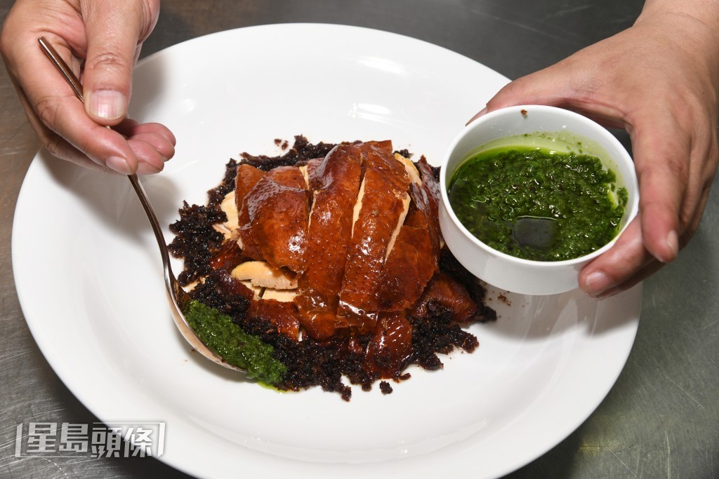有多國煮食經(jīng)驗的邵德龍師傅(紅棉主廚),擅長將菜式結合各種烹飪技巧,炮制成與別不同的原創(chuàng)料理。以今天示范的椒麻蔥油脆皮雞為例,不但運用川菜及粵饌的調(diào)味風格,靈感還有來自西餐的香草醬,令傳統(tǒng)脆皮雞的味道變得更具層次及多樣化。