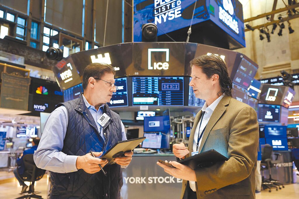 ▲受到中美關(guān)稅戰(zhàn)暫時(shí)和解影響,美股12日一開盤全線井噴,以大漲慶賀。圖為紐約證交所內(nèi)2名交易員正在交談。(路透)