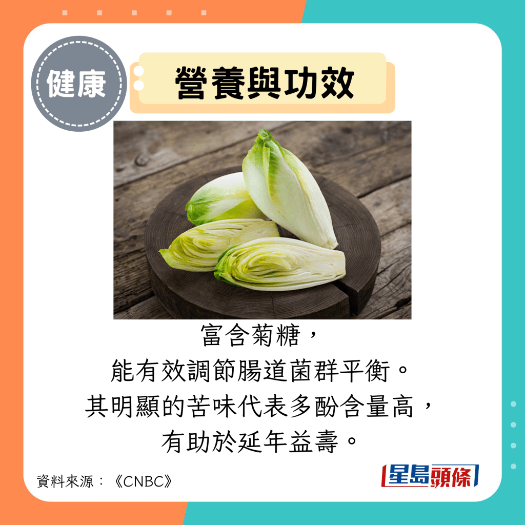 這種蔬菜富含菊糖,能有效調(diào)節(jié)腸道菌群平衡。其明顯的苦味代表多酚含量高,有助于延年益壽。特別是紅菊苣,是抗氧化劑的絕佳來源,能保護(hù)身體免受自由基的傷害。建議生吃菊苣,也可以與牛油果醬一起食用。