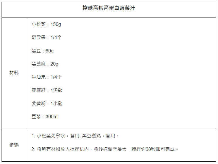 張醫(yī)生也分享了一款特別為早餐設(shè)計的蔬菜汁食譜,不但加入了充足蛋白質(zhì),增加飽足感,適合上班一族飲用;也加入了小松菜、姜黃粉等,提供鈣質(zhì)和抗發(fā)炎的功效。