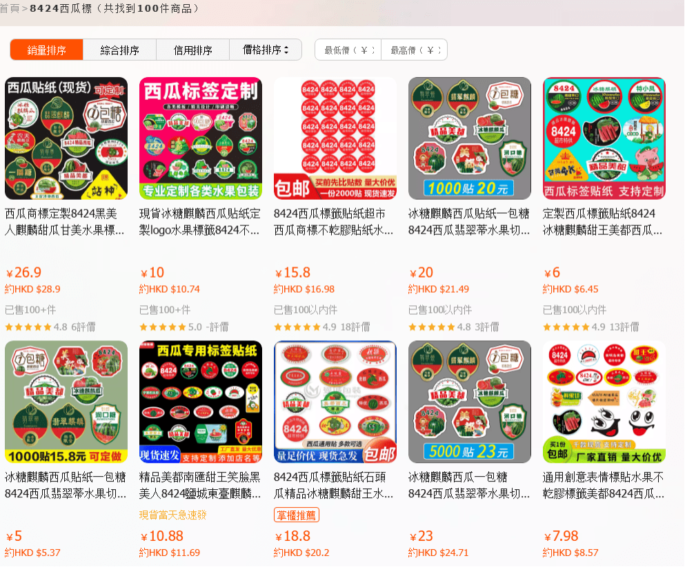 《星島申訴王》發(fā)現(xiàn),在內(nèi)地網(wǎng)購淘寶上,只需不到20元人民幣便可購得一整套“8424”西瓜標(biāo)簽。以店家銷量最好的“紅色標(biāo)簽”為例,一套僅售15.8元人民幣,內(nèi)含100張貼紙,每張有20個,足以貼上2000個西瓜。除了最常見的紅底白字標(biāo)簽外,還有各式各樣同樣標(biāo)示“8424”的貼紙可供選擇。當(dāng)記者詢問商家是否可以將這些標(biāo)簽貼于其他品牌的西瓜時,商家直言“想貼什么都可以”。