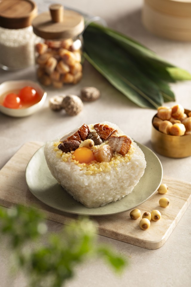 富豪酒店今年推出6款粽子,傳統(tǒng)與創(chuàng)意并重,其中“富豪至尊嫲嫲手作潮州粽”以““嫲嫲”獨(dú)門秘方炮制,重新演繹潮州粽的傳統(tǒng)風(fēng)味,加入五花腩、綠豆邊和咸蛋黃,再添加由豬油網(wǎng)包裹著的紅豆沙,咸甜滋味完美交融?!案缓乐磷鹪货U魚(yú)瑤柱粽”則以十頭鮑魚(yú)、日本宗谷頂級(jí)干瑤柱及五花腩肉,利用咸蛋黃的香氣將味道升華?!案缓乐磷痣p黃瑤柱裹蒸粽”包括兩顆金黃咸蛋黃,帶出干瑤柱及其他餡料的鮮香。