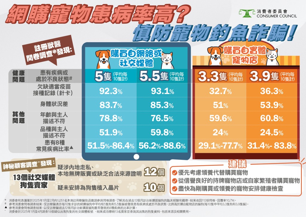 調(diào)查發(fā)現(xiàn)上網(wǎng)購貓狗有較多出現(xiàn)健康狀況欠佳,比例明顯高于購自實體寵物店的貓狗,逾9成網(wǎng)購貓狗于求診時欠缺適當(dāng)疫苗接種紀錄; 消委會以神秘顧客方式在今年1月至4月成功接觸13名網(wǎng)上賣家,發(fā)現(xiàn)約9成賣家疑涉內(nèi)地走私或本地?zé)o牌繁殖或販賣等,消委會呼吁當(dāng)局嚴厲打擊無牌販賣和非法走私寵物活動,同時提醒消費者,網(wǎng)購寵物時若遇上走數(shù)或貨不對辦情況將難以追討,因此應(yīng)避免網(wǎng)購寵物及考慮以領(lǐng)養(yǎng)代替購買,杜絕寵物釣魚詐騙。