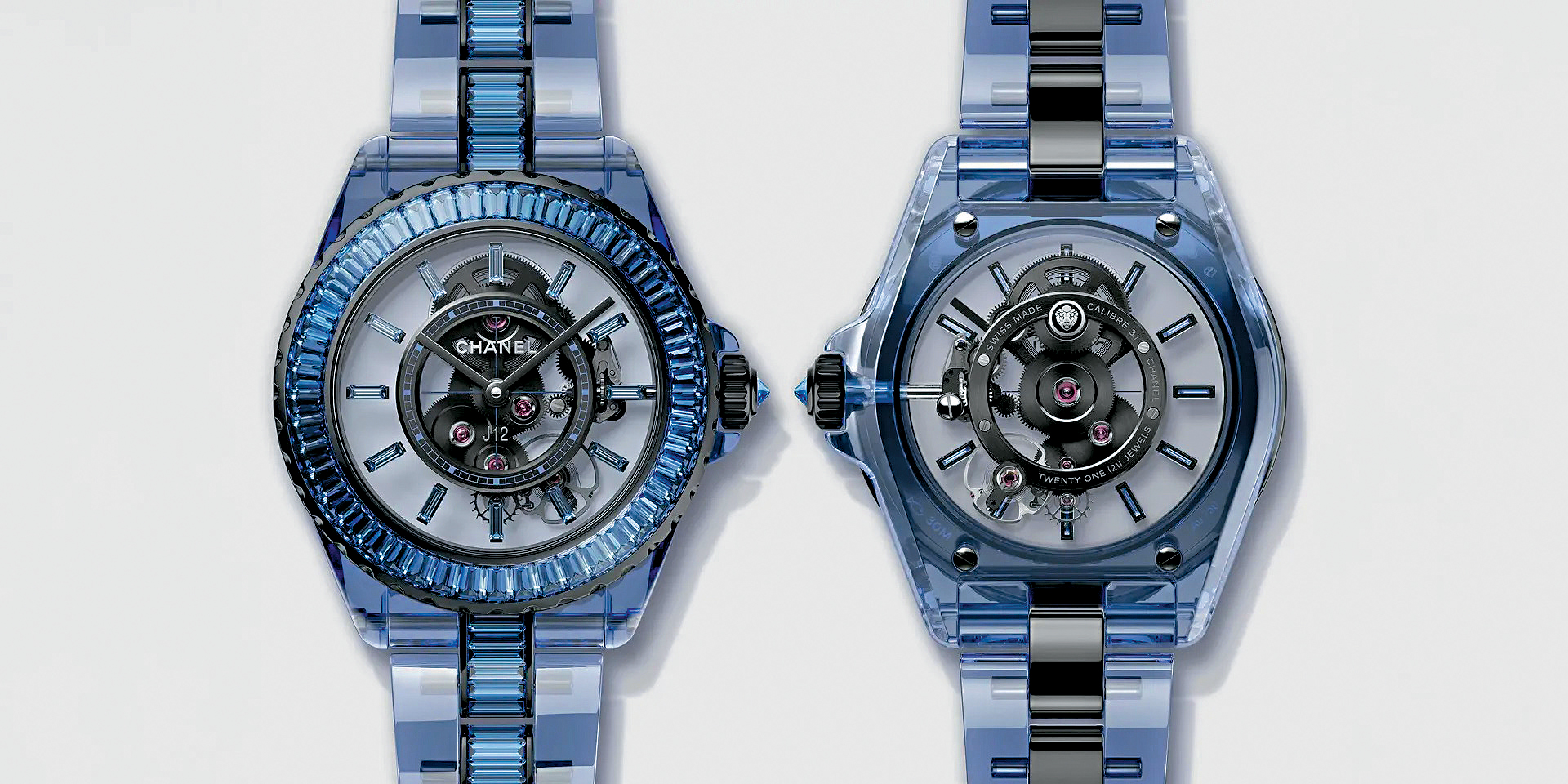向透明設(shè)計(jì)致敬的J12 Bleu X-Ray,獨(dú)特的藍(lán)調(diào)啟發(fā)自晴天下的藍(lán)色海洋與蔚藍(lán)天空。表殼與鏈帶均以整塊新研發(fā)的藍(lán)色藍(lán)寶石水晶制作,并融入黑色涂層18K白金。品牌獨(dú)家研發(fā)的藍(lán)色,是工匠將藍(lán)色粉末染料混合鐵、鈦和少量的鉀注入透明藍(lán)寶石水晶塊中,精心調(diào)配出來(lái)的專有色調(diào)。表圈、時(shí)標(biāo)及表鏈均鑲有長(zhǎng)階梯形切割藍(lán)寶石,表圈的46顆共重5.61卡,時(shí)標(biāo)那12顆共重0.43卡,表鏈的138顆共重約10.15卡。另表冠鑲有1顆0.17卡的明亮切割藍(lán)寶石。