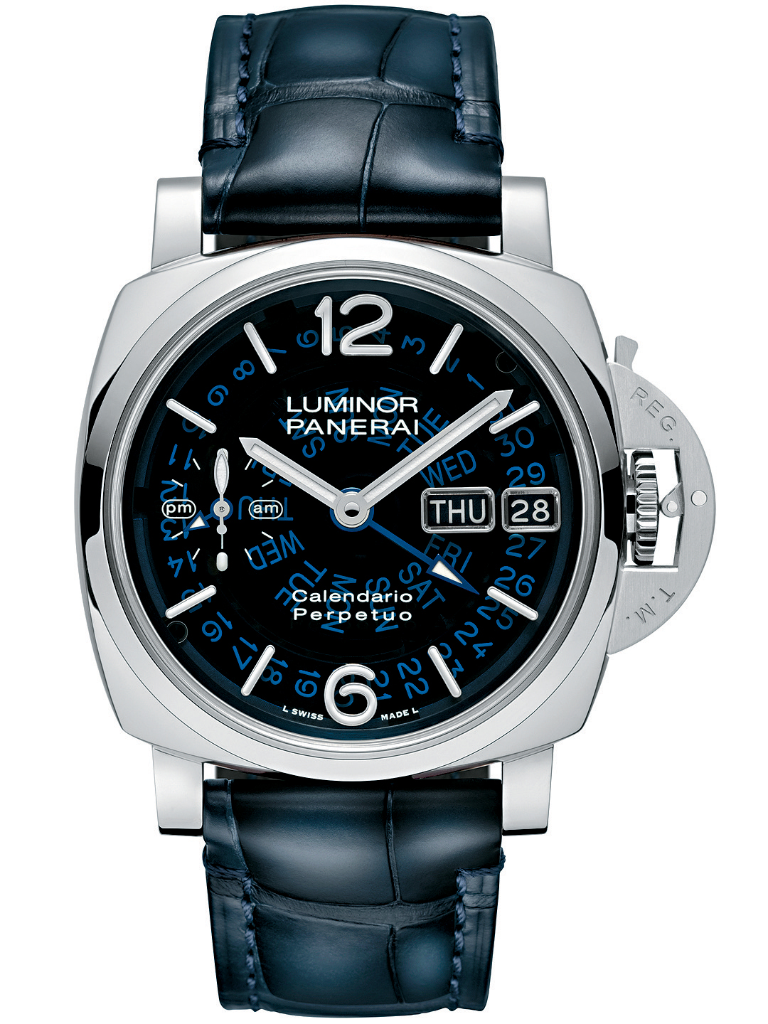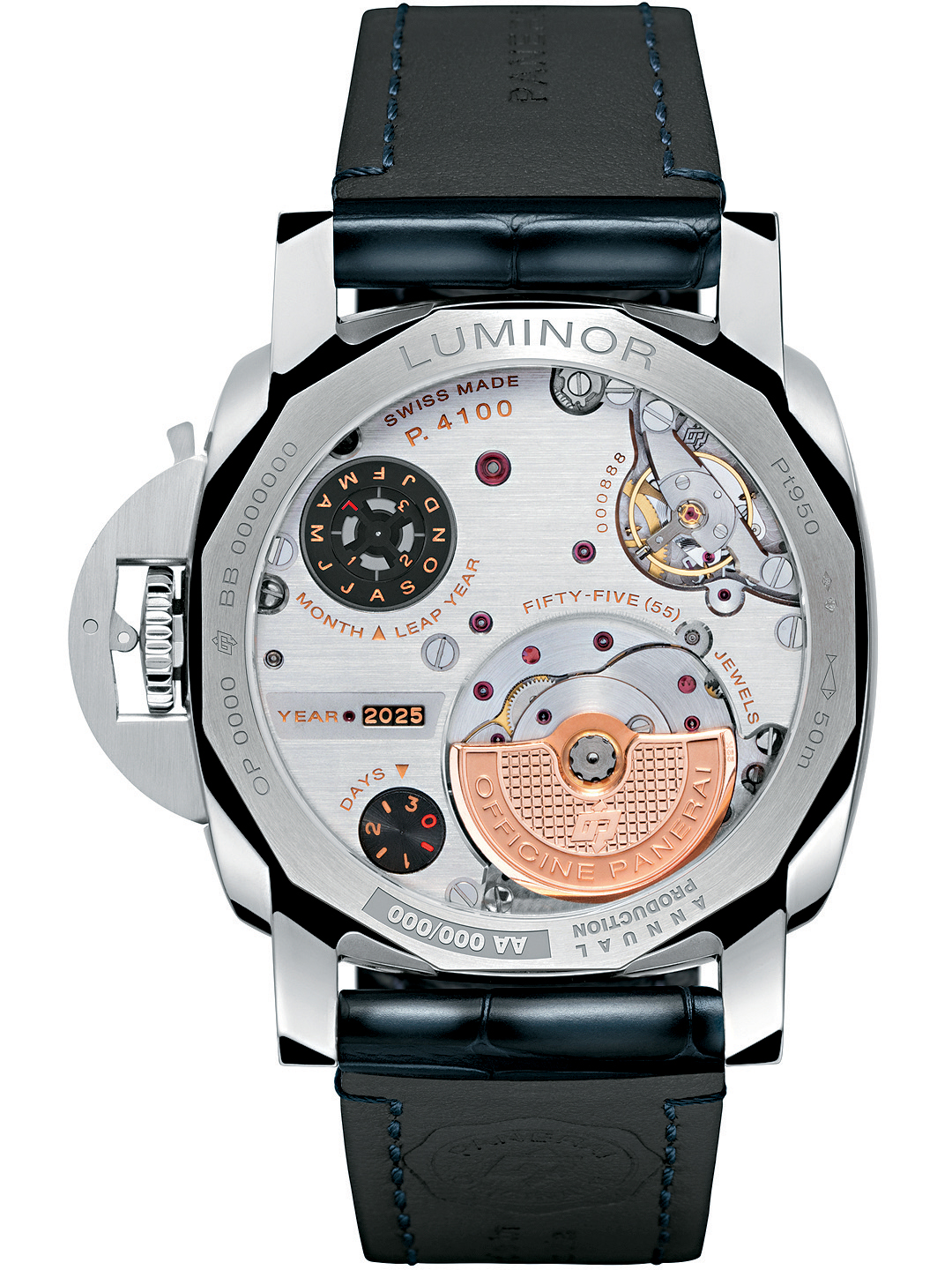 擁有GMT兩地時(shí)間顯示功能的Luminor萬(wàn)年歷腕表,今年新添一位成員加入。新表的44mm表殼采用了較傳統(tǒng)鉑金硬度高出40%的品牌專利鉑金Platinumtech (一種含有95%純鉑金的新研發(fā)合金)制作,3點(diǎn)位設(shè)日期顯示,9點(diǎn)位則是小秒盤(pán)和24小時(shí)顯示。表盤(pán)設(shè)計(jì)與現(xiàn)有的綠面款式不同,選用藍(lán)色藍(lán)寶石水晶制作,可透視內(nèi)藏的機(jī)芯結(jié)構(gòu),尤其日期和星期轉(zhuǎn)碟,令腕表的視覺(jué)層次更見(jiàn)豐富,機(jī)械感亦倍顯強(qiáng)烈。