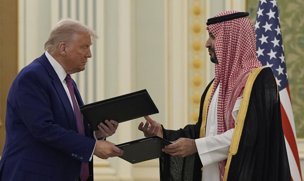美國(guó)總統(tǒng)特朗普13日在利雅得王宮的簽約儀式中,和沙特阿拉伯王儲(chǔ)沙爾曼(Mohammed Bin Salman)交換文件。美聯(lián)社