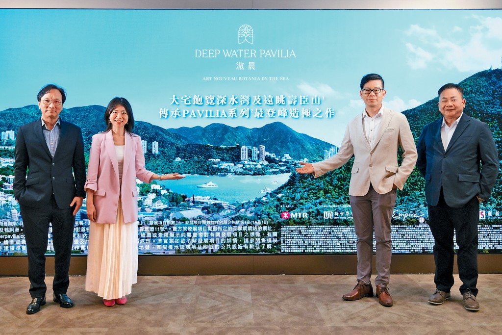 ▲新世界何家欣(左二)表示,滶晨最快周內(nèi)開放示范單位供預(yù)約參觀。右二為帝國(guó)姚志偉、資本策略何樂輝(左一)、麗新潘銳民(右一)。