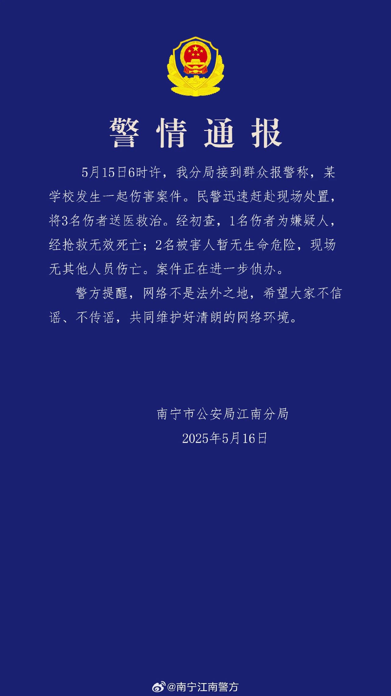 5月16日晚,廣西南寧市公安局江南分局通報:5月15日6時許,南寧某學(xué)校發(fā)生一起傷害案件。民警迅速趕赴現(xiàn)場處置,將3名傷者送醫(yī)治療。經(jīng)初查,1名傷者為嫌疑人,經(jīng)搶救無效死亡;2名被害人暫無生命危險,現(xiàn)場無其他人員傷亡。案件正在進一步偵辦。