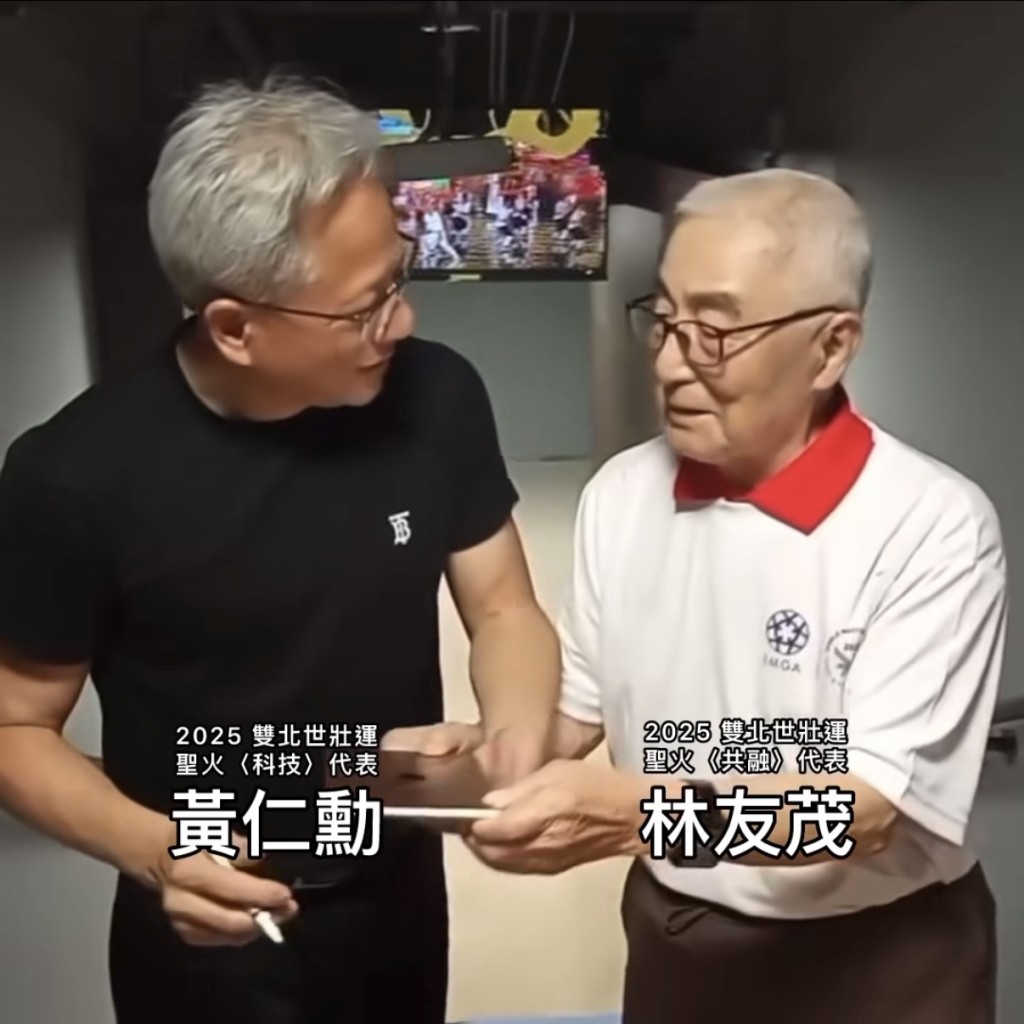 臺(tái)北世界壯年運(yùn)動(dòng)會(huì)(世壯運(yùn))開幕,輝達(dá)(NVIDIA)行政總裁黃仁勛與104歲“健力士世界紀(jì)錄最年長羽毛球選手”林友茂等5人成為壓軸圣火手。網(wǎng)傳黃仁勛與林友茂后臺(tái)互動(dòng)花絮影片,黃仁勛給林友茂簽名時(shí),很驚訝對(duì)方已104歲,于是立即向他請(qǐng)教長壽的秘密,沒想到林友茂幽默回答:“多看美女!”讓全場(chǎng)笑翻。