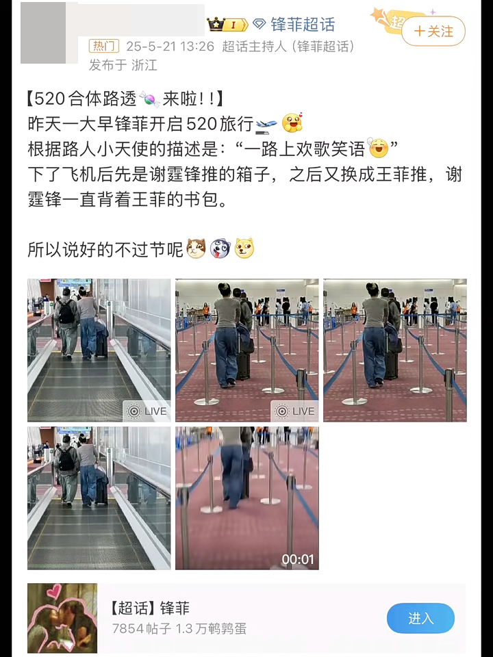 今日(21日)內地社交平臺流傳,被指是謝霆鋒與王菲被捕獲的照片,他們的粉絲轉發(fā)到微博超話,更引述拍到他們的網民表示:“跟據路人小天使的描述是‘一路上歡歌笑語’,下了飛機后先是謝霆鋒推的箱子,之后又換成王菲推?!备蟊x霆鋒一直背著王菲的背包,CP粉都大呼:“好甜!”同時又嘲曾表示不愛“過節(jié)”慶祝的二人竟選在“520”出游,說:“所以說好的不過節(jié)呢?”