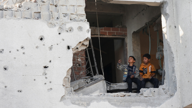 ▲2025年5月21日,巴勒斯坦男孩坐在在加沙帶賈巴利亞的一棟被以色列炸毀的房屋里。(路透社)