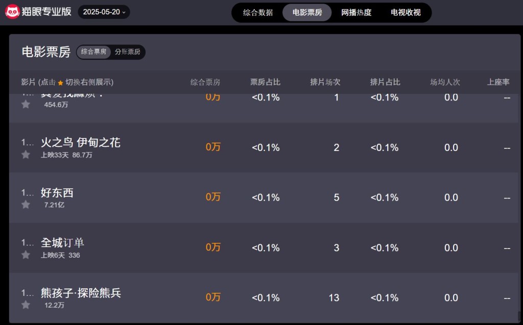 ▲截至5月20日《全城訂單》亦只有336人民幣,累計觀眾人次只有12人。