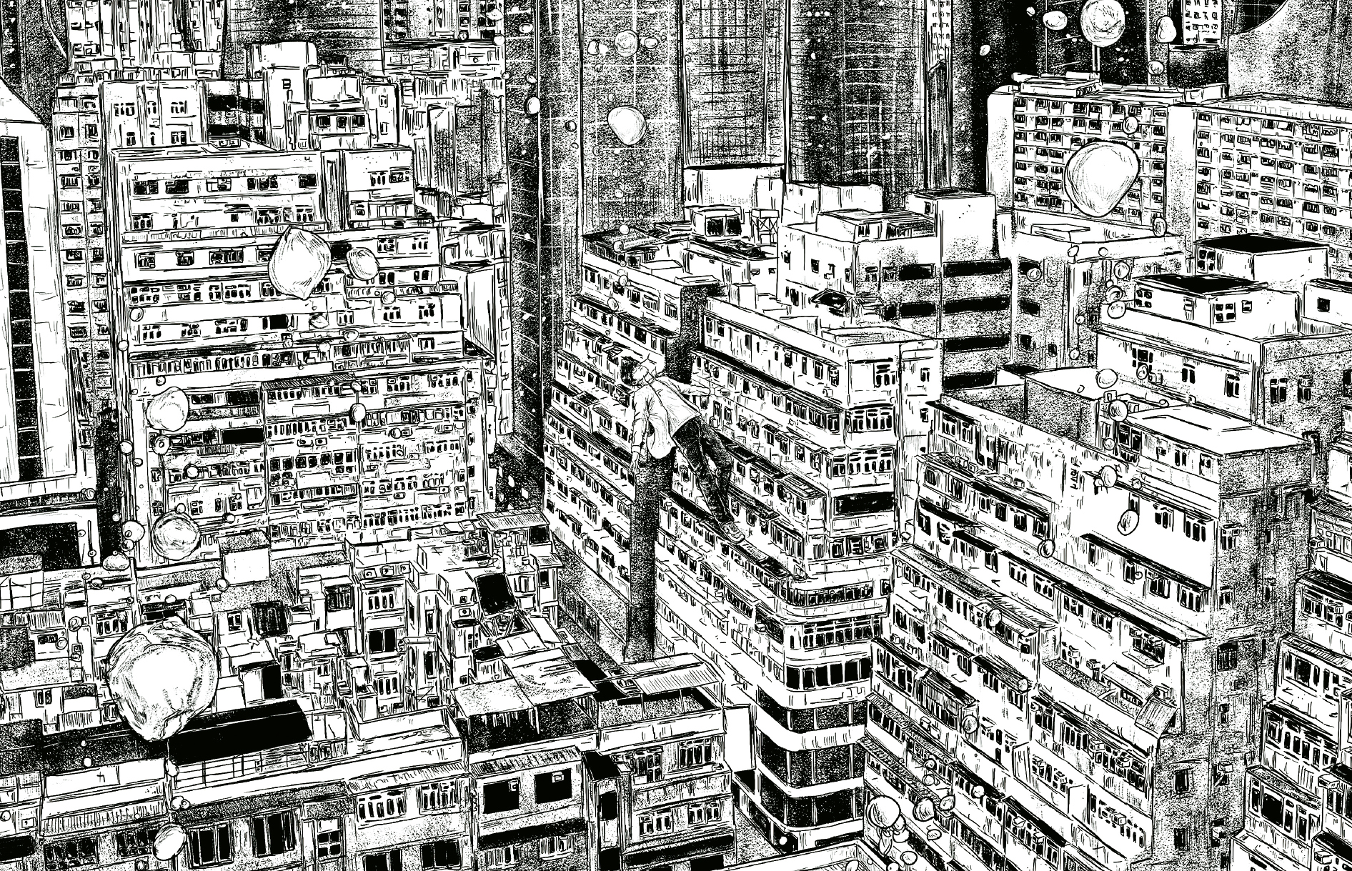 蘇頌文曾因迷上日漫而對漫畫產生興趣,并嘗試利用黑色墨水筆臨摹日漫風格。后來港漫《風云》出現(xiàn),令他發(fā)現(xiàn)原來漫畫可以利用線條去傳達真實感?!芭啪€整齊或混亂、下筆的力度,都會令到畫面的演繹方式更獨特。這不正是傳統(tǒng)中國畫線條的藝術嗎?”這次蘇頌文便以“寫實的超現(xiàn)實為主題,繼續(xù)他繪畫香港之旅程。