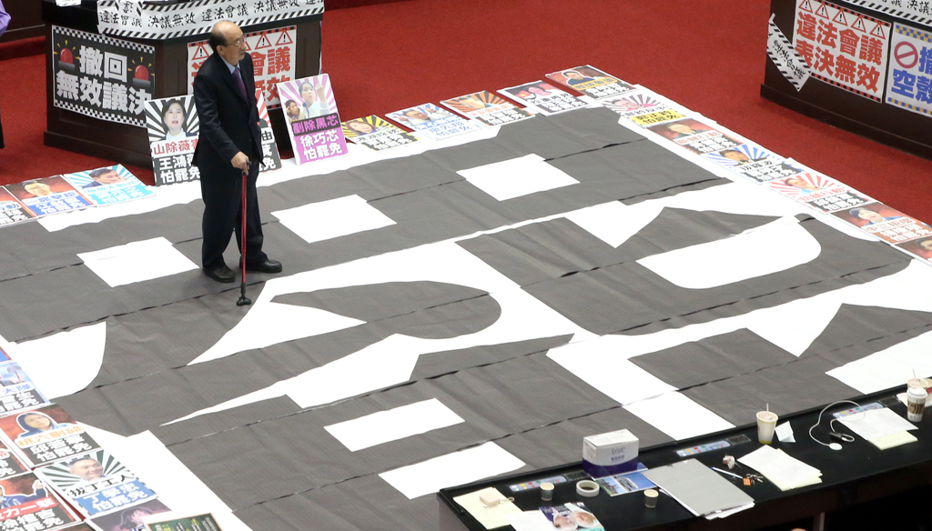 ▲民進(jìn)黨“立委”過去在“立法院”議場(chǎng)中央布置的“罷”字。示意圖/中時(shí)資料照
