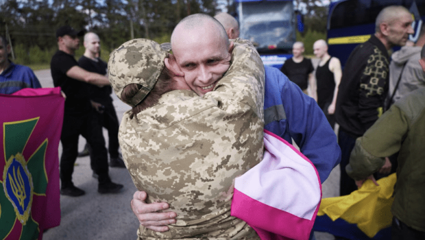 在烏克蘭北部的切爾尼希夫州(Chernihiv region),剛獲釋的烏克蘭軍人抵達(dá)一間醫(yī)院,身披國(guó)旗、神情憔悴,多人剃光頭,有人當(dāng)場(chǎng)與家屬激動(dòng)擁抱、喜極而泣。