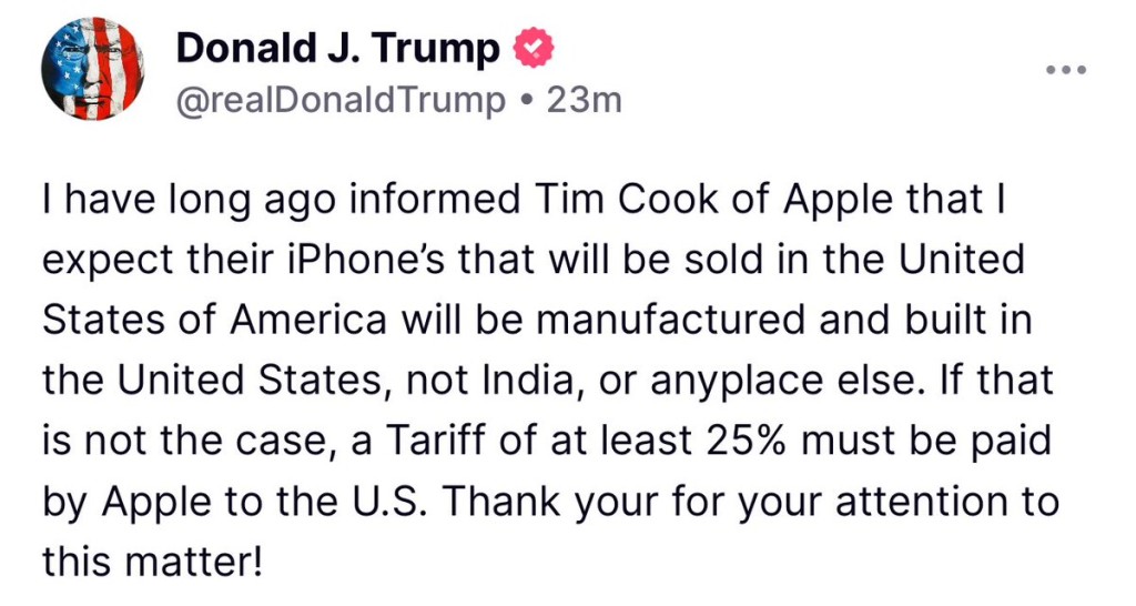 美國(guó)總統(tǒng)特朗普(Donald Trump)以關(guān)稅政策逼迫制造業(yè)回歸美國(guó)本土,他上周出訪中東期間,自爆向蘋(píng)果(Apple)行政總裁庫(kù)克(Tim Cook)明言,他“不希望蘋(píng)果在印度設(shè)廠”。特朗普23日再度開(kāi)火,在自家社交平臺(tái)發(fā)文表示,希望在美國(guó)銷(xiāo)售的iPhone都是本土制造,否則蘋(píng)果必須向美國(guó)支付最少25%關(guān)稅。