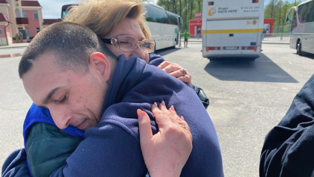 俄羅斯人權(quán)專員在白俄一處秘密地點擁抱獲釋的俄羅斯士兵。 美聯(lián)社