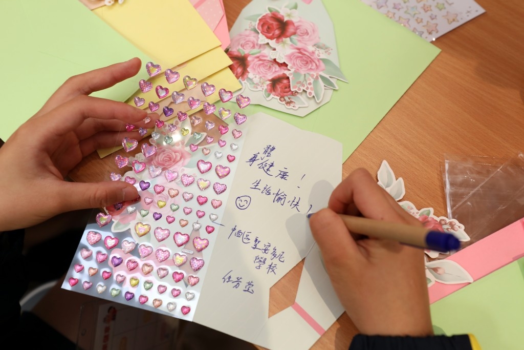 ▲兩名學生大使江昫穎(左)及余信行(右)希望透過心意卡祝福字句讓長者感受人間溫暖。